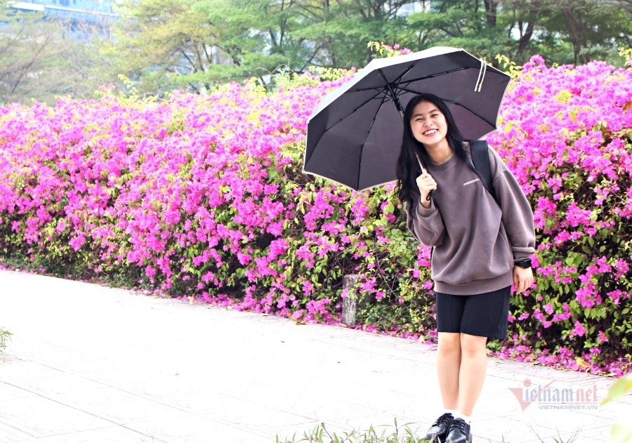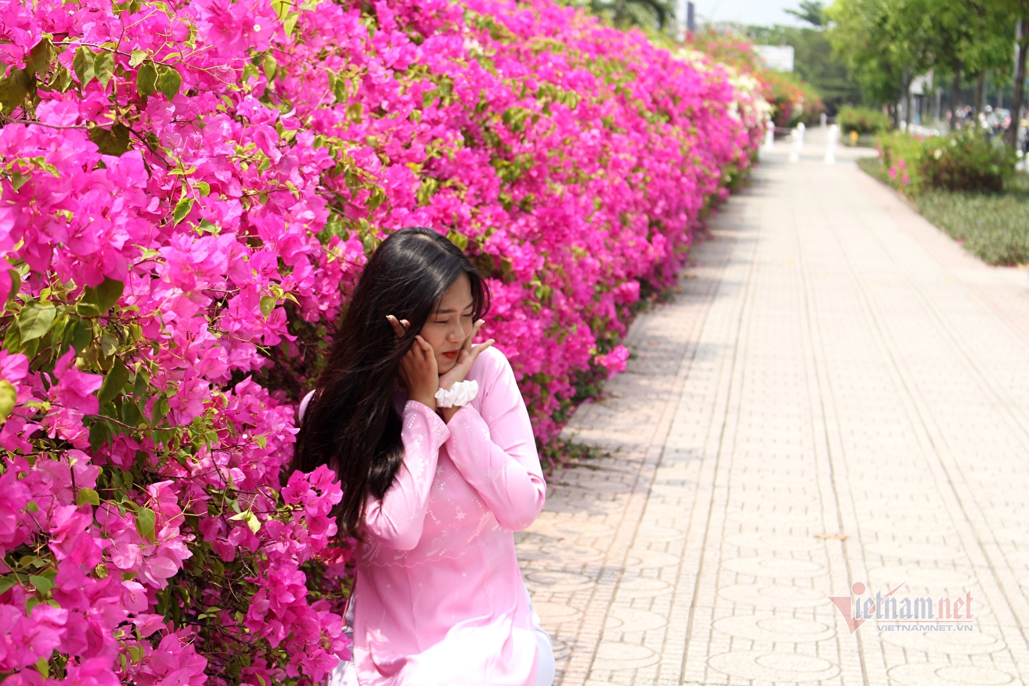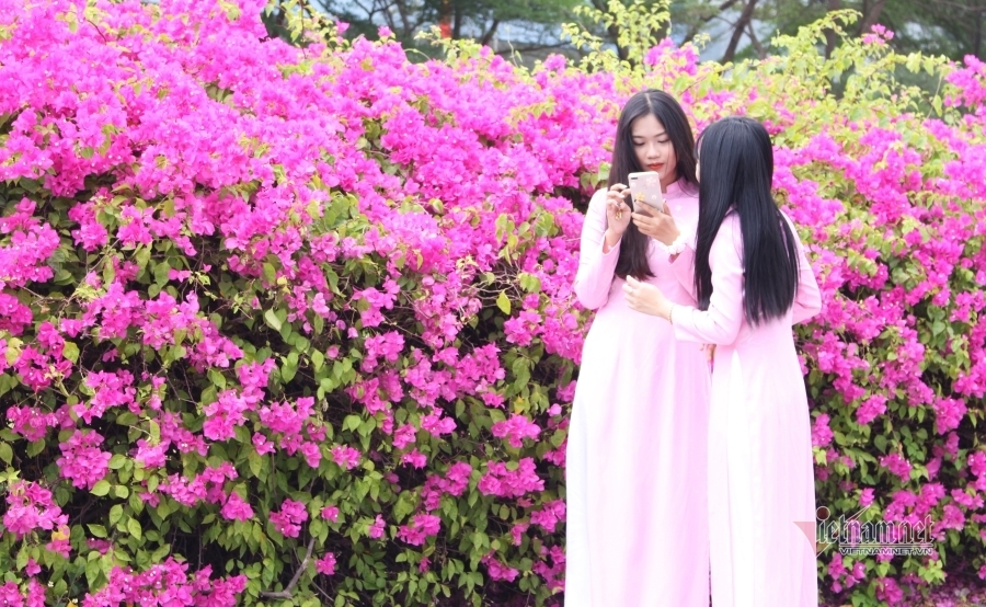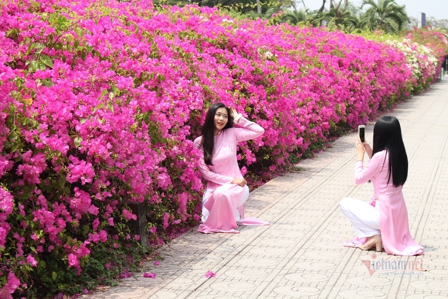 Ngày nắng đẹp, sinh viên, người đi đường… thi nhau ghé vào bức tường đỏ rực màu hoa giấy tại trường Đại học Tôn Đức Thắng để chụp ảnh, quay phim.