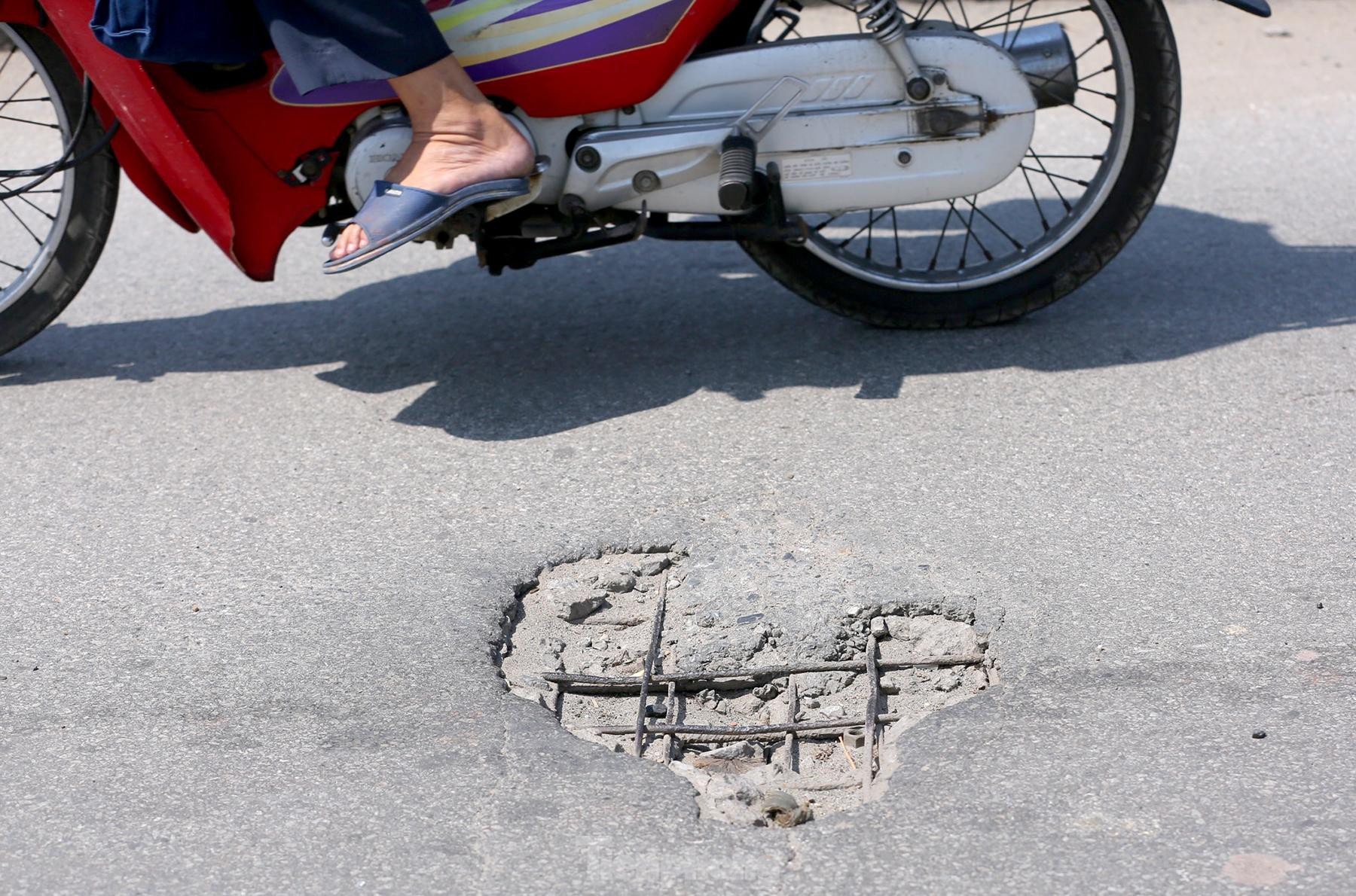 Mặt đường đầy vết vá chằng chịt sau nhiều lần sửa chữa.