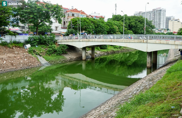 Dòng nước tại sông Tô Lịch gần một ngày qua bỗng trở lên xanh ngắt hiếm thấy khiến nhiều người lưu thông dọc 2 bên sông cảm thấy thích thú.