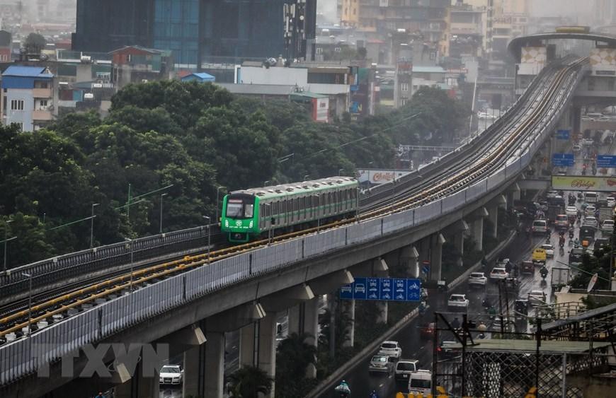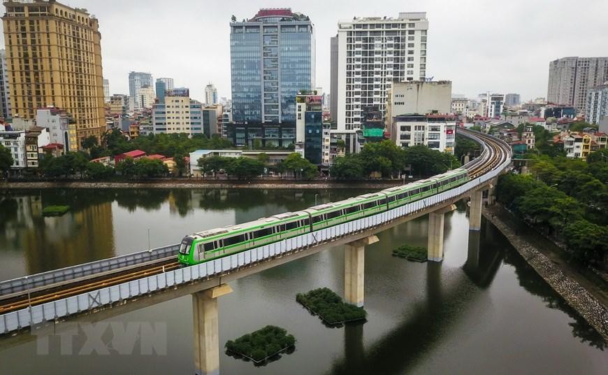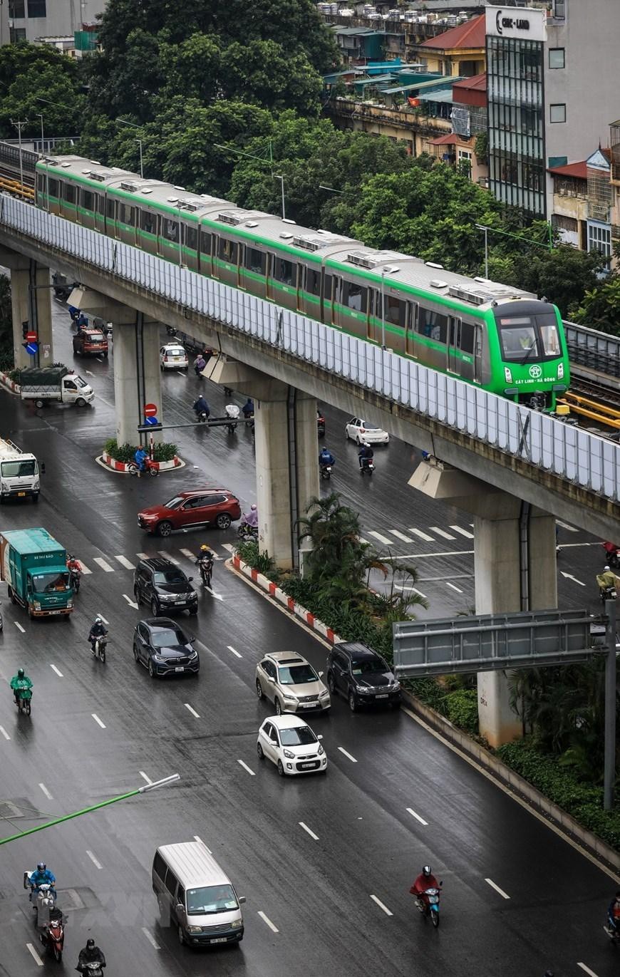 Tuyến đường sắt đô thị Cát Linh-Hà Đông khi được đưa vào khai thác thương mại sẽ hoạt động liên tục từ 5 giờ tới 23 giờ hằng ngày, góp phần giảm thiểu ùn tắc giao thông Hà Nội. (Ảnh: Huy Hùng/TTXVN)