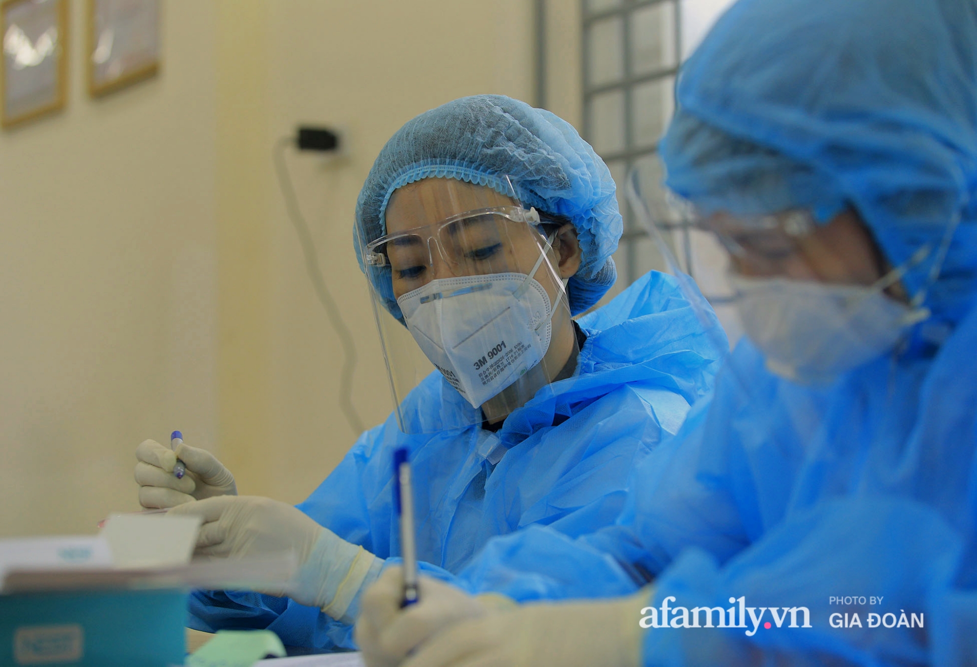 Do số lượng đông, Trung tâm Y tế H.Thanh Trì đã huy động kíp 6 cán bộ y tế sang hỗ trợ, phục vụ cho công tác lấy mẫu được diễn ra nhanh chóng, đảm bảo.