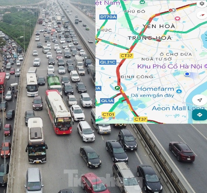 Ngay thời điểm 16h ngày 15/1, chưa đến giờ cao điểm chiều nhưng Vành đai 3 đã ùn tắc từ dốc cầu Thanh Trì đến gần cầu Thăng Long, dài gần 30 km, biến đường Vành đai 3 "đối ngoại" thành Vành đai đỏ (ảnh nhỏ).