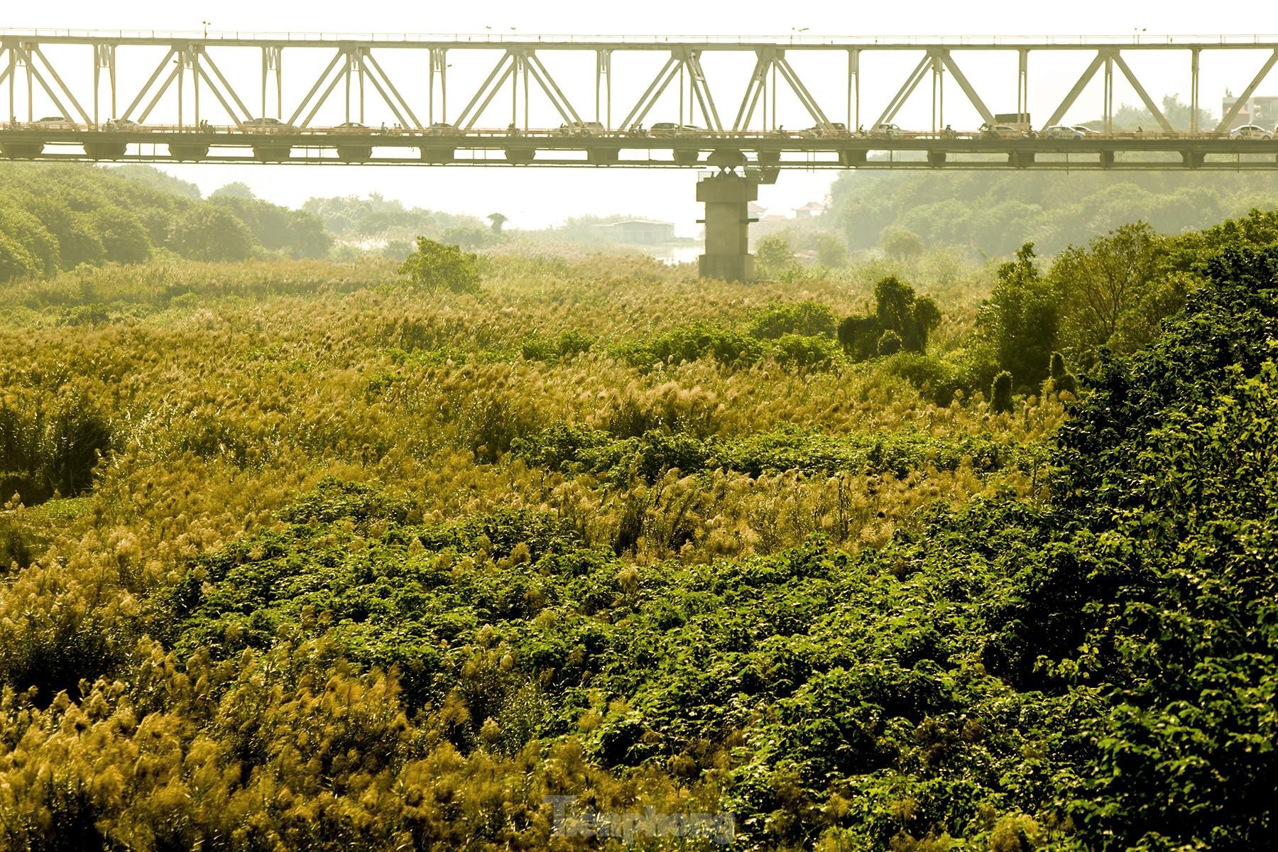 Dưới chân cầu Long Biên có một cánh đồng cỏ lau trắng đang bung nở, phủ kín cả bãi bồi dọc bờ sông Hồng khiến ai có dịp đi qua cũng mê đắm ngắm nhìn.