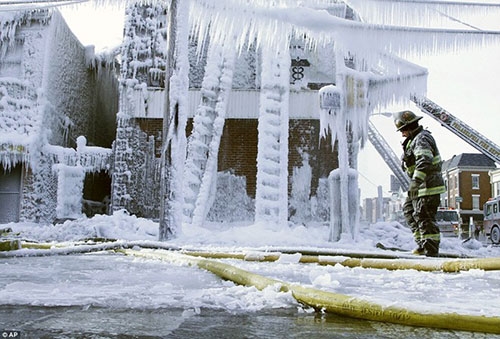 Một vụ hỏa hoạn tại Trung tâm Y tế Locust, thành phố Philadelphia vào tối 20/2 khiến nhân viên cứu hỏa phải phun nước để dập lửa. Nhưng vào sáng 21/2, nước tạo thành khối băng phủ kín tòa nhà. Ảnh: AP |