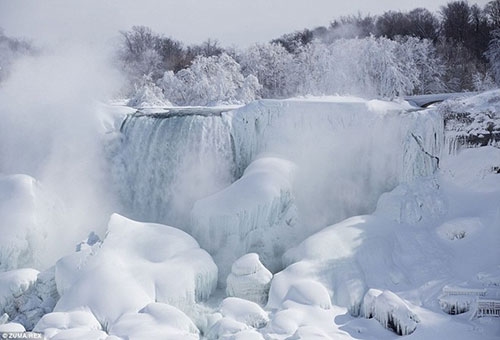 Nước của thác Niagara lừng danh đóng băng khi đang chảy, tạo nên cảnh tượng siêu thực. Những cây gần thác cũng "hóa đá". Ảnh: REX |