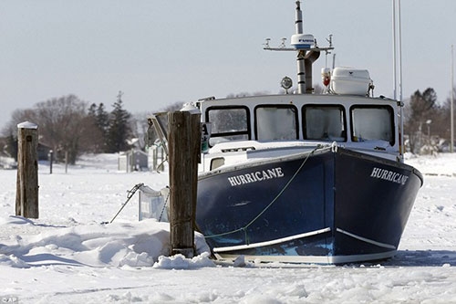 Một tàu ở thành phố tại cảng ở thành phố Hingham, bang Massachusetts bỗng dưng mắc cạn do nước xung quanh đóng băng. Ảnh: AP |