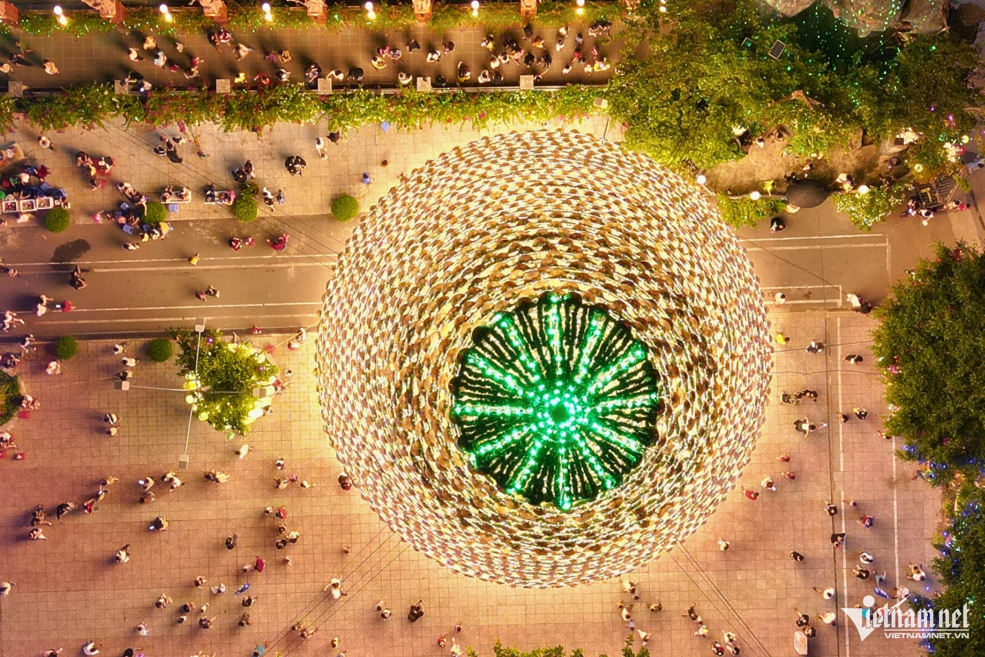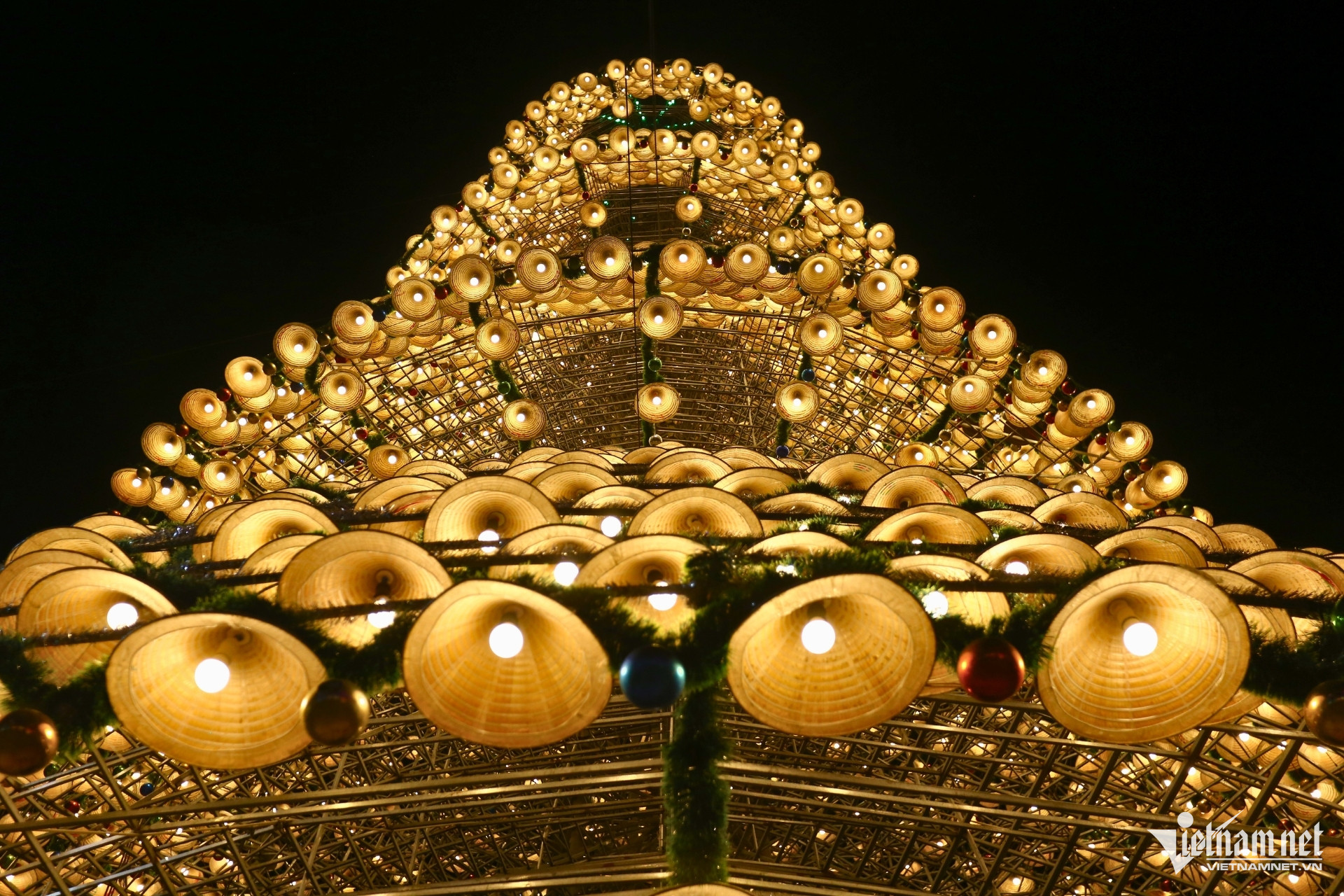 Mỗi tối, vào lúc 19h, cây thông “khổng lồ” cao gần 40m được tạo dựng từ hơn 3.800 chiếc nón lá truyền thống Việt Nam bắt đầu được lên đèn.