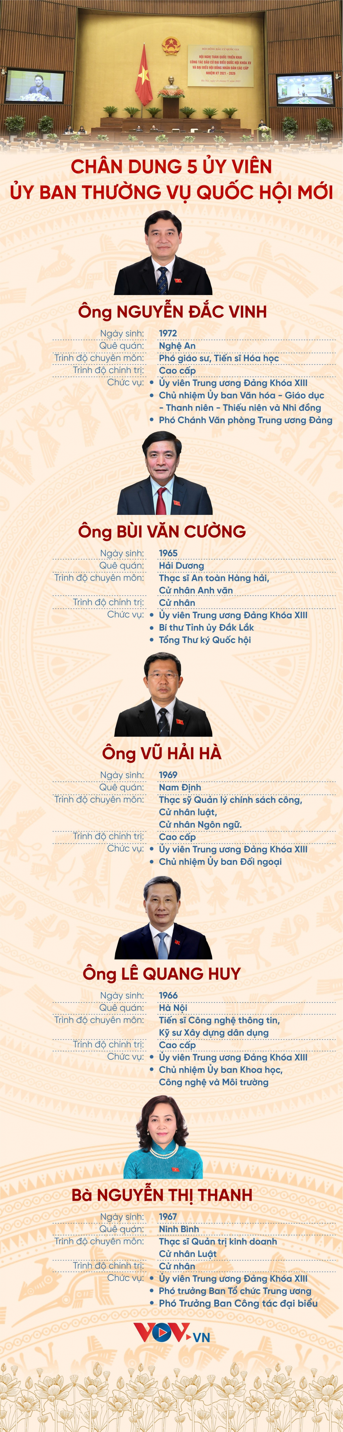 Ông Bùi Văn Cường, ông Nguyễn Đắc Vinh, ông Vũ Hải Hà, ông Lê Quang Huy và bà Nguyễn Thị Thanh là 5 Ủy viên Ủy ban Thường vụ Quốc hội mới.