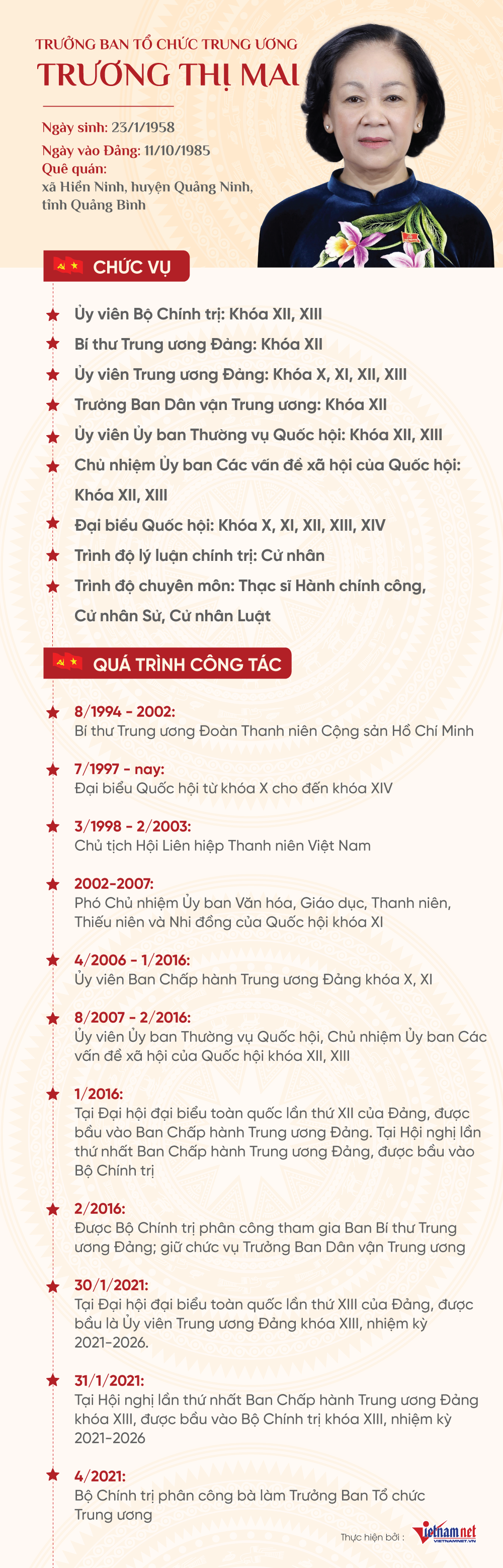 Với việc Bộ Chính trị phân công nhiệm vụ, bà Trương Thị Mai trở thành nữ Trưởng Ban Tổ chức Trung ương đầu tiên trong lịch sử.