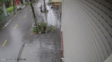 Như trong chiều cùng ngày, 1 đoạn clip do camera an ninh nhà dân ghi lại tình huống thoát chết hy hữu của người đàn ông khiến nhiều người hú vía. Theo đó, vào khoảng hơn 16h ngày 7/9, khi người đàn ông đang hối hả đội mưa vội vã chạy về cửa nhà thì một tấm tôn lớn bị gió thổi bay đã bất ngờ văng tới.