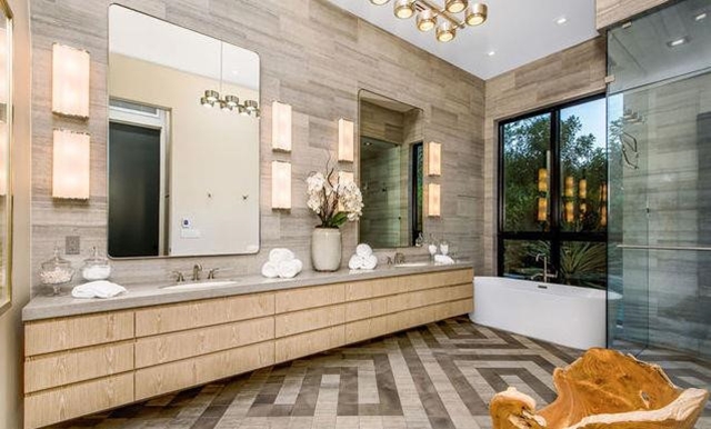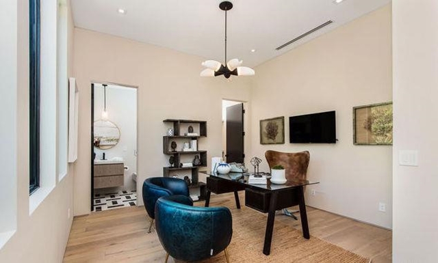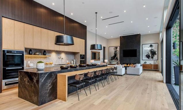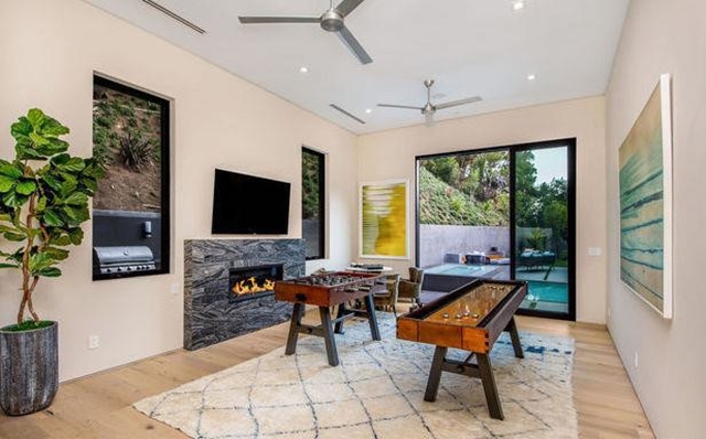 Căn nhà này có 5 phòng ngủ, 6 phòng tắm, được thiết kế với phong cách đương đại cùng các tiện ích nổi bật như camera giám sát, nhà xe lớn, rạp chiếu phim cùng quầy bar nhỏ trong nhà.