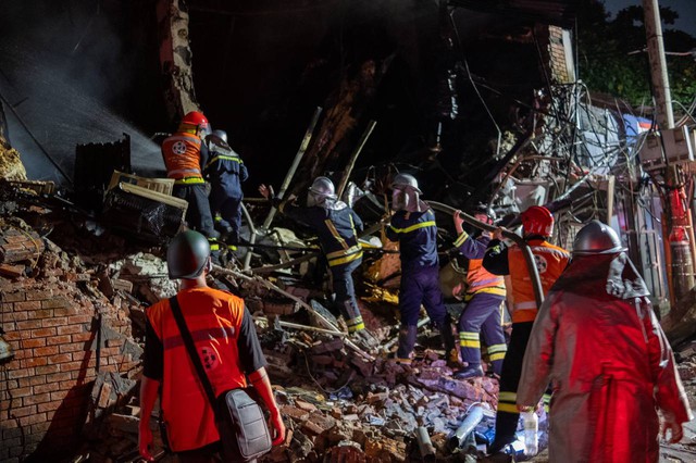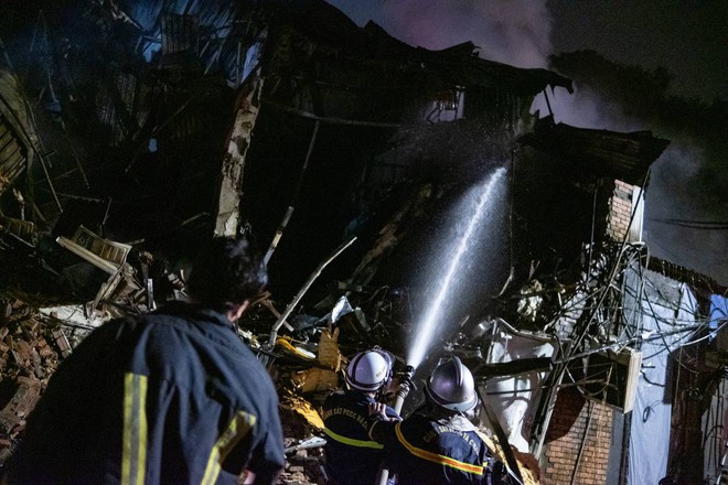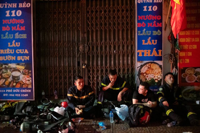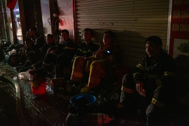 Các chiến sĩ PCCC thấm mệt, ngồi bệt xuống đất nghỉ ngơi sau khi nổ lực dập tắt đám cháy quán bar trên phố Phó Đức Chính, phường Trúc Bạch, quận Ba Đình, Hà Nội.