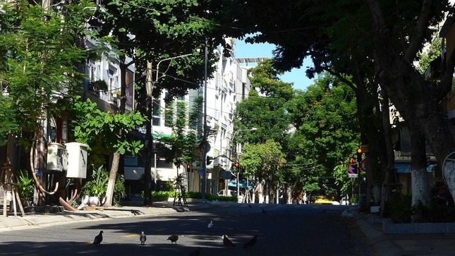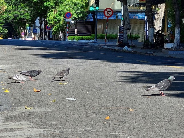 Những con chim câu lững lững đi bộ nhặt mồi trên những đường phố chính vốn luôn đông đúc ồn ào như là điểm nhấn của thành phố Đà Nẵng sau 8 giờ sáng hôm nay, khi chính thức bước vào "7 ngày vàng" cửa đóng then cài.