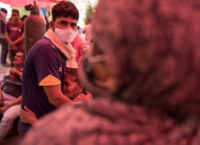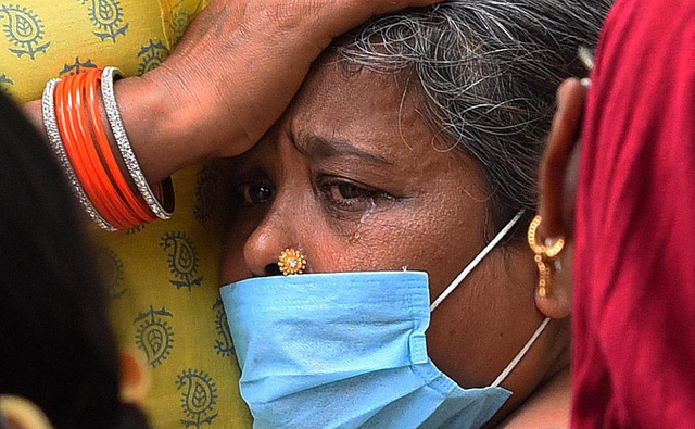 Hình ảnh một người thân của một bệnh nhân chết vì Covid-19 được an ủi tại địa điểm hỏa táng ở Jammu. Mặc dù là nước sản xuất vaccine hàng đầu thế giới, nhưng chỉ có 2% dân số Ấn Độ được tiêm chủng.