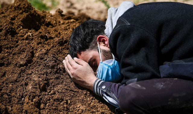 Một người đàn ông tuyệt vọng gục đầu buồn bã sau khi thực hiện các nghi thức cuối cùng cho người thân đã chết.
