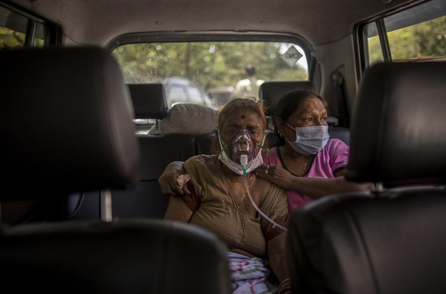 Một bệnh nhân nhiễm Covid-19 nằm trong một chiếc xe đậu bên ngoài bệnh viện ở Ahmedabad, chờ để được đưa đi điều trị .