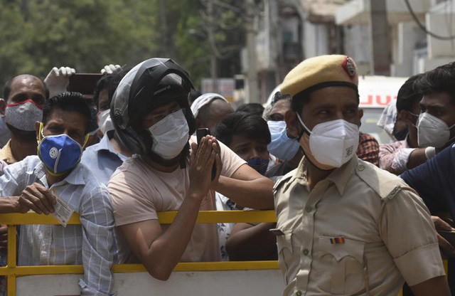 Các bệnh viện khắp quốc gia này vẫn tiếp tục thiếu trầm trọng vật tư y tế, đặc biệt là bình oxy. Trong ảnh là một người thân của bệnh nhân nhiễm Covid-19 cầu xin cảnh sát cho mình xin "một suất" để cứu người nhà đang hấp hối...