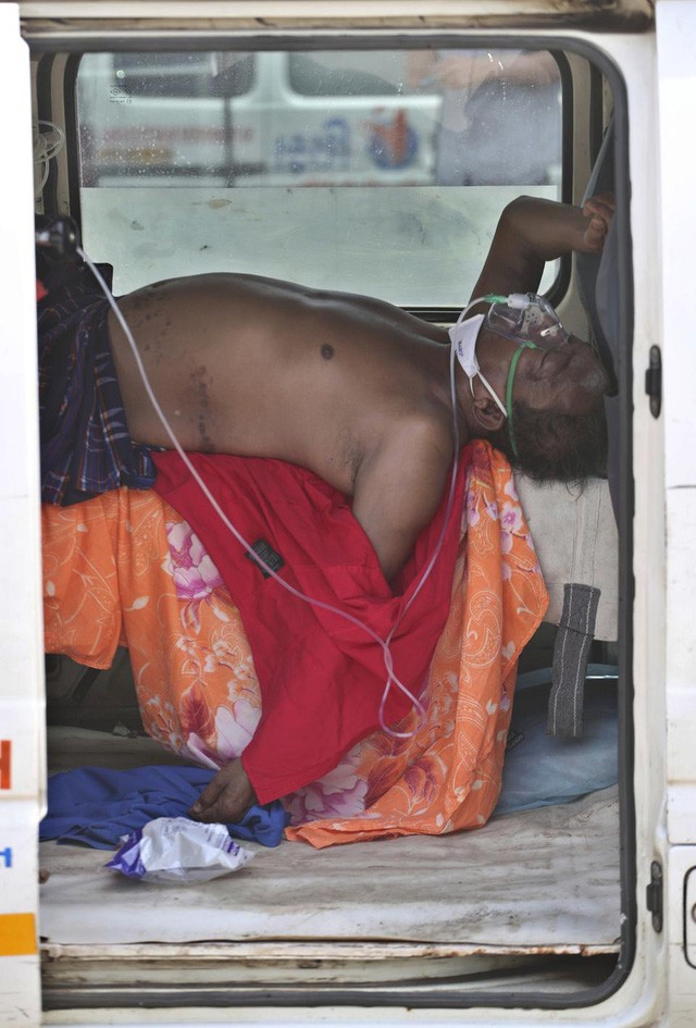 Một người đàn ông đang gắng gượng để thở với sự hỗ trợ của bình khí oxy khi ngồi trong một chiếc xe kéo.