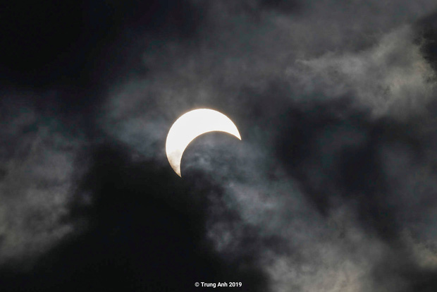 Mặc dù bầu trời có lúc có mây, nhưng qua ống kính thiên văn, hiện tượng bộ ba Mặt trời, Mặt trăng và Trái đất thẳng hàng nhau sáng nay rất ngoạn mục. Khi quan sát từ Trái đất, Mặt trăng che khuất phần lớn Mặt trời khiến bầu trời tối hẳn, trong khi quầng sáng của quả cầu lửa đỏ rực.