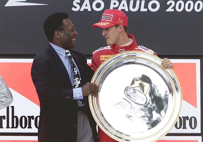 Pele lên trao giải cho Michael Schumacher sau khi tay đua người Đức thắng chặng Grand Prix ở Sao Paulo năm 2000