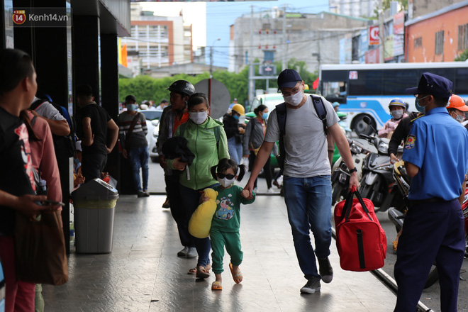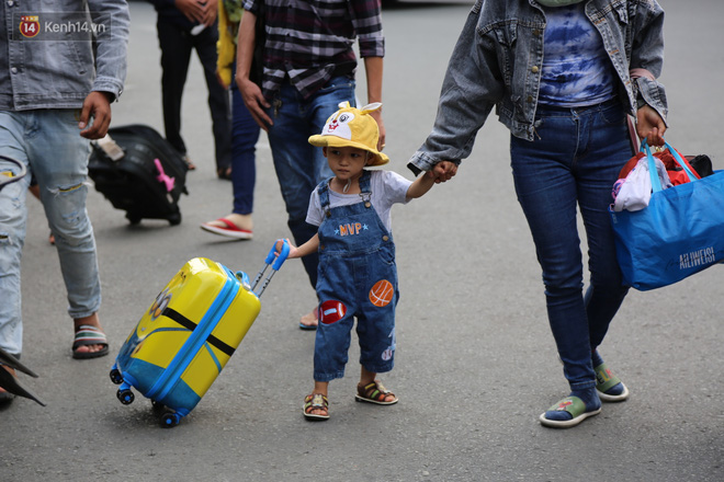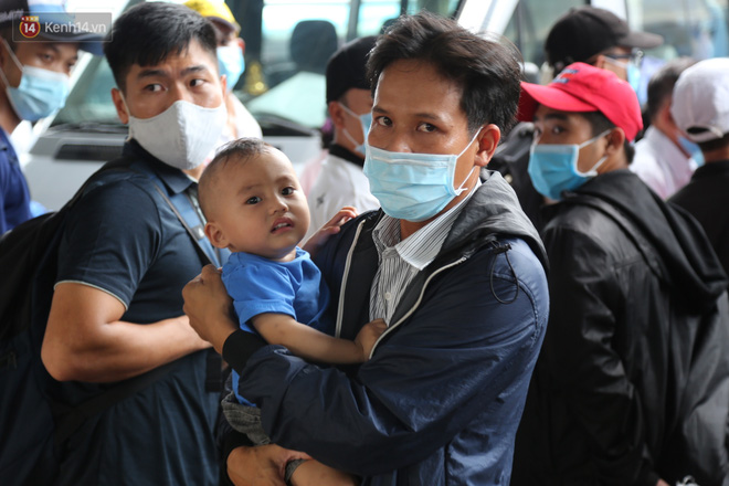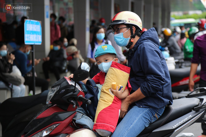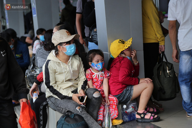 Một số em nhỏ mệt mỏi, ngủ gục trên vai bố mẹ, bến xe cũng liên tục nhắc nhở người dân chấp hành tốt việc đeo khẩu trang để đề phòng lây lan dịch bệnh.