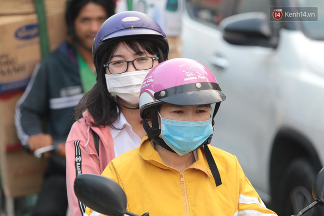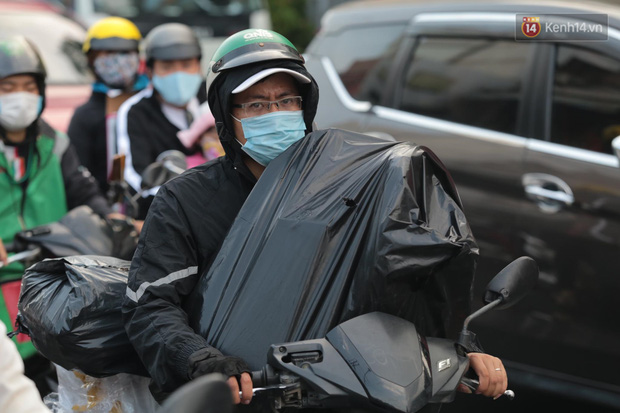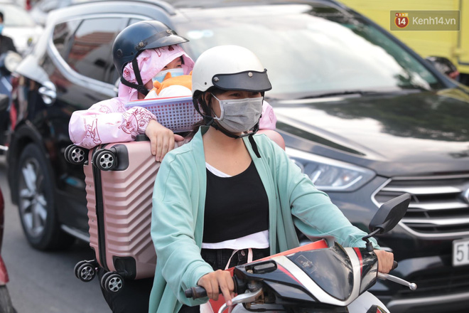 Nhiều người hành lý cồng kềnh trên xe máy được xe ôm công nghệ chở ra bến xe. Do bị kẹt xe kéo dài, chỉ nhúc nhích từng chút trên đường khiến nhiều người khá mệt mỏi.