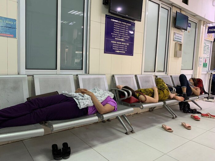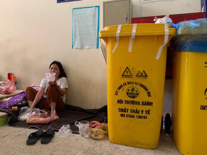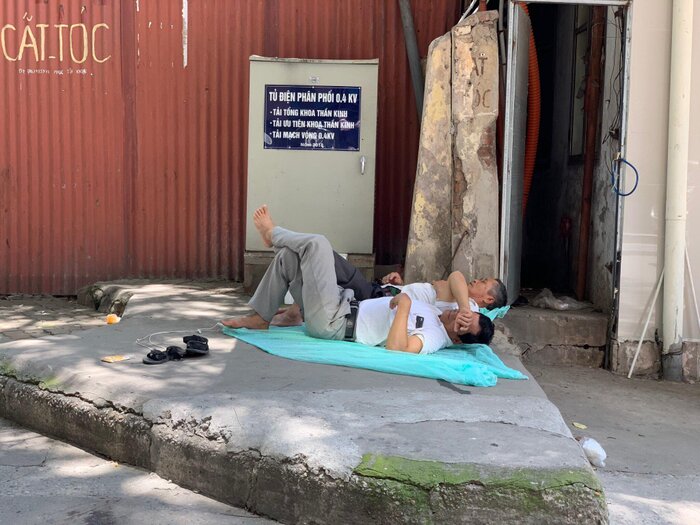 Nhiều người nhà bệnh nhân ở bệnh viện Bạch Mai vật vờ, mệt mỏi ngồi ngoài hành lang, ngả lưng nghỉ ngay trên bậc thềm dưới thời tiết nắng nóng lên đến 40 độ C.