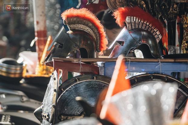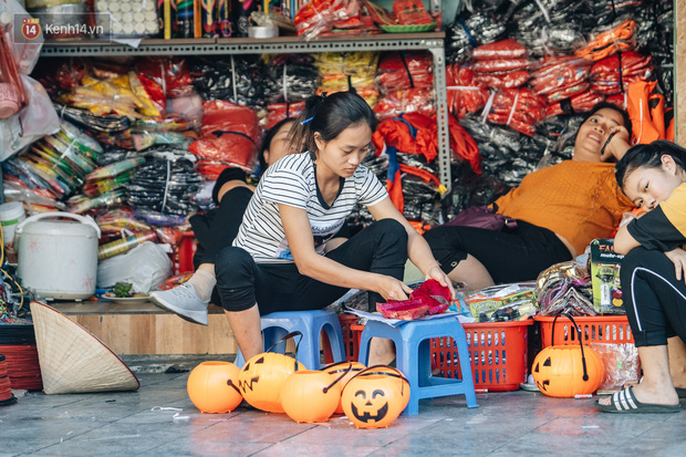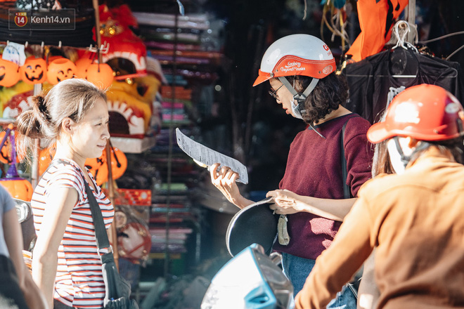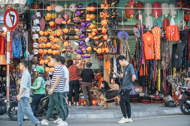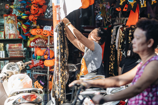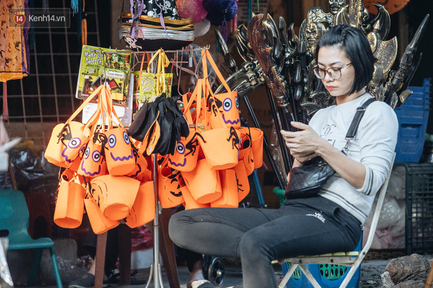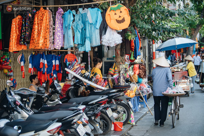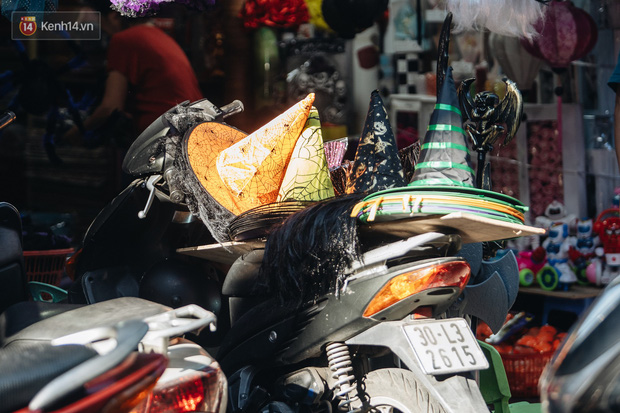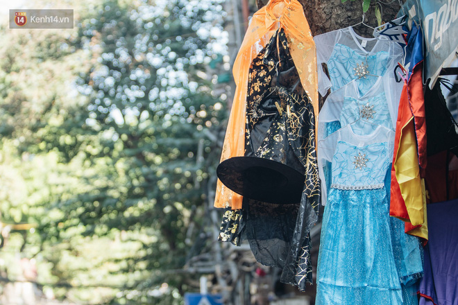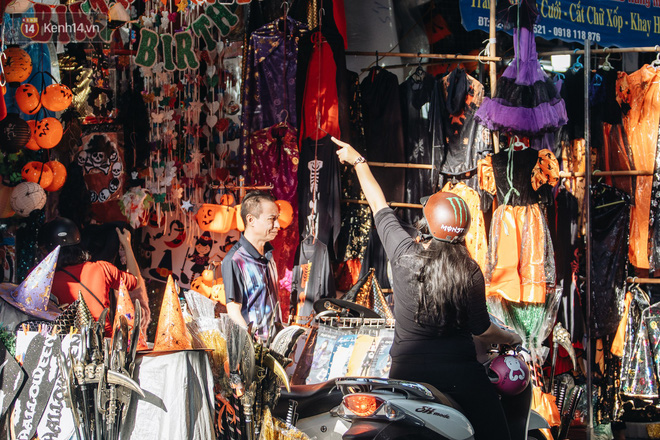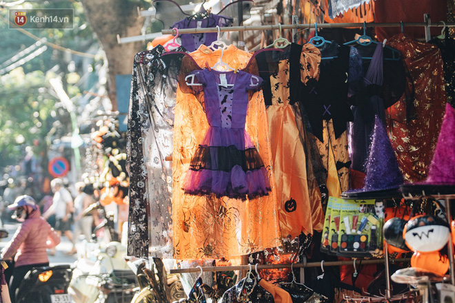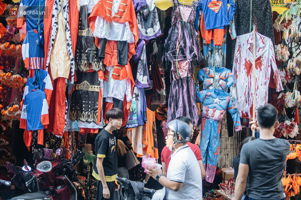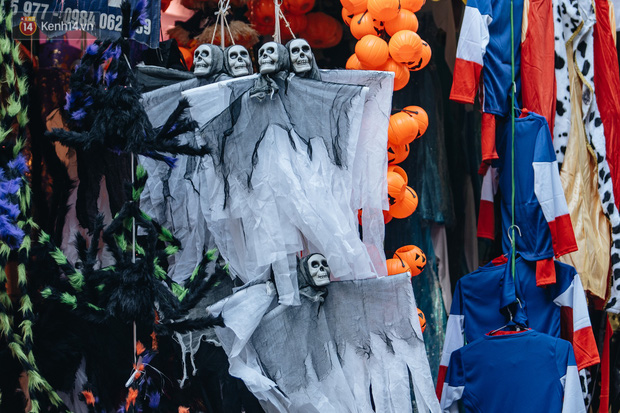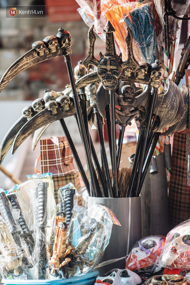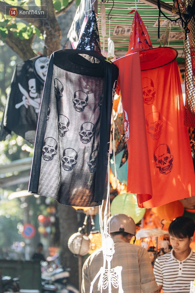 Những bộ trang phục đậm chất "hù dọa" tràn ngập tại hầu hết các gian hàng. Mặt nạ, nón phù thủy, tóc giả, hình nộm, bộ xương, lưỡi hái, kiếm, đèn bí đỏ,... đem đến vô vàn sắc màu ma quỷ trên phố Hàng Mã, một ngày trước lễ hội Halloween.