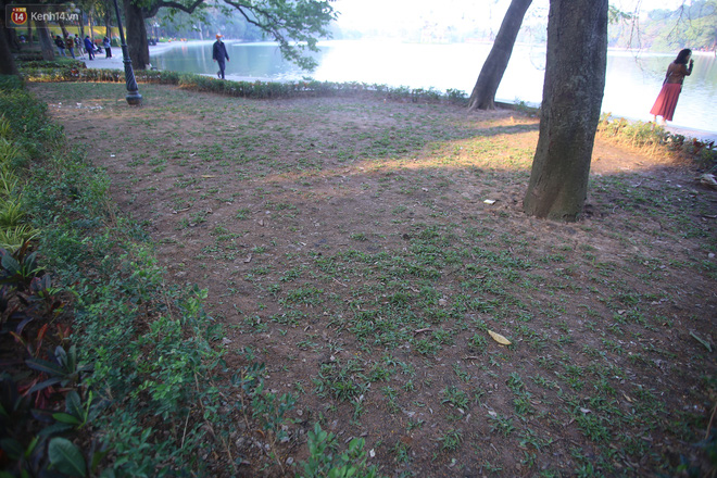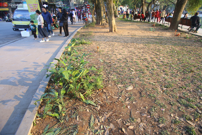 Theo ghi nhận của PV, hiện tại nhiều thảm hoa dọc xung quanh hồ Hoàn Kiếm không còn nguyên vẹn, nhiều bồn hoa chỉ còn bãi đất trống do nhiều người cố tình dẫm đạp các bồn hoa khiến hoa hư hỏng trong đêm bắn pháo hoa chào đón năm mới 2021.
