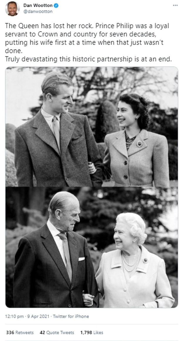 Sáng ngày 9/4 (giờ địa phương), Hoàng thân Philip - phu quân của Nữ hoàng Elizabeth đã từ trần ở tuổi 99. Ngay lập tức, không khí quốc tang u buồn và tiếc thương bao trùm Anh quốc. Trong hàng chục năm qua, Hoàng thân Philip và Nữ hoàng vẫn luôn là biểu tượng của Hoàng gia và được người dân vô cùng yêu mến, kính trọng. Trước sự ra đi của Hoàng thân, hàng loạt hoạt động tưởng niệm đã được tổ chức để tỏ lòng tiếc thương.