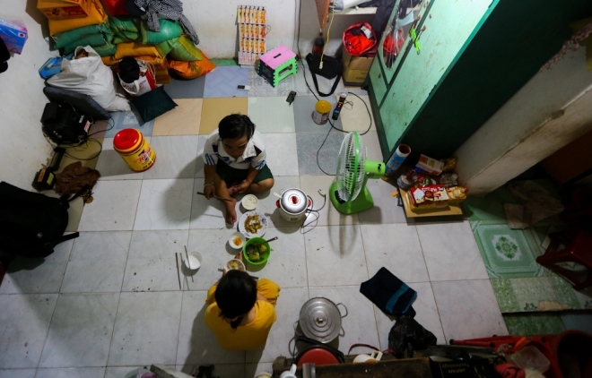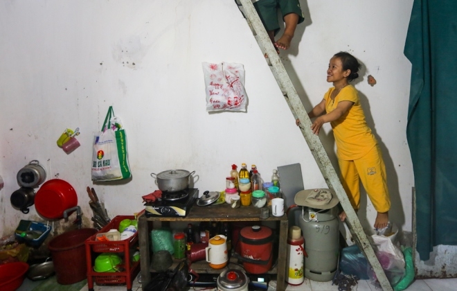 Giữa trưa và buổi chiều hai vợ chồng lại về nhà trọ nghỉ ngơi, lo chuyện cơm nước. Chị Đào chỉ đi chợ một bữa ăn cho cả ngày. |