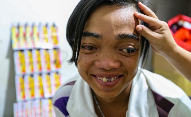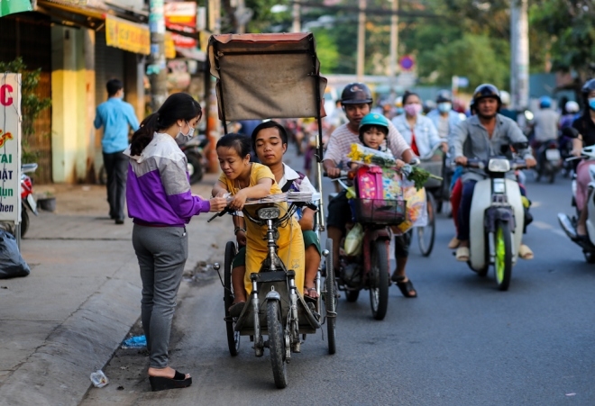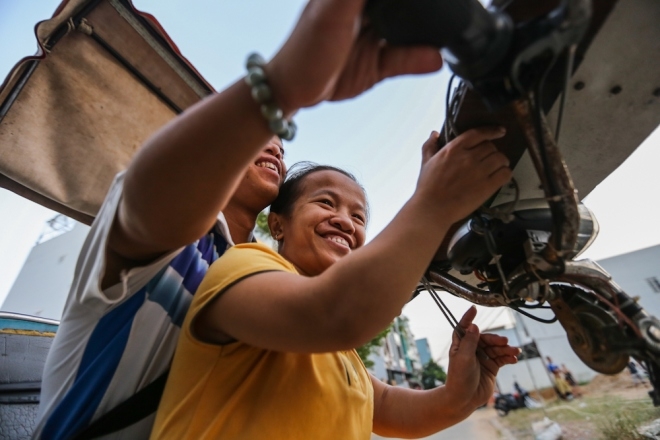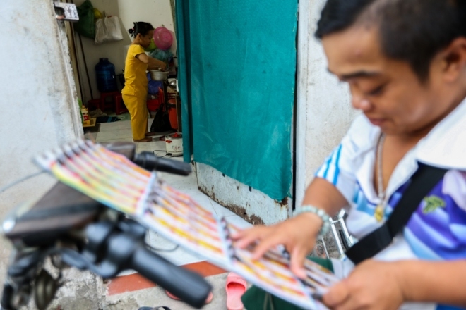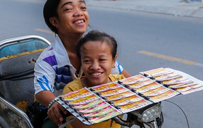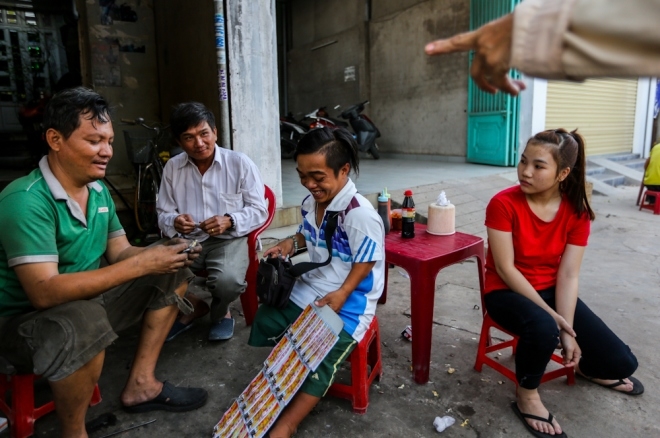 Mỗi ngày, hai vợ chồng lấy 150 tờ vé số về bán. Anh vô mời khách, còn chị ngồi trên xe lăn được người ta cho mượn tạm. "Tôi biết cặp đôi tí hon này lâu rồi, cứ thấy họ đi ngang qua là gọi lại mua vài tờ. Nhiều khi xe họ hư mình cũng sửa miễn phí luôn", anh Huỳnh Quốc Trung (40 tuổi, thợ sửa xe, quận Bình Tân) cho biết. |