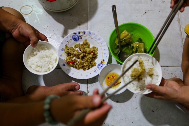 Bữa cơm lúc nào cũng đạm bạc, họ cố gắng chỉ ăn không quá không quá 60.000 đồng một ngày. "Ăn uống tiết kiệm vậy mà nhiều khi cũng không đủ chi xài nhất là khi ốm đau. Cũng may có người cho gạo nên đỡ được phần nào", người vợ cho biết. |