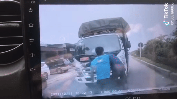 Không dừng lại, nam tài xế mặc áo xanh vẫn tiếp tục dùng cùi trỏ đấm vào đầu, mặt người áo đen khiến người này choáng váng. Khi thấy tài xế áo đen ngã, người áo xanh mới chịu bỏ đi.