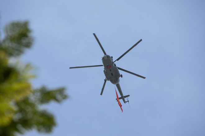 | Trực thăng kéo cờ Đảng, cờ Tổ quốc trên bầu trời TP HCM |