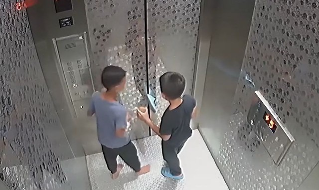 Đoạn phim CCTV cho thấy hai đứa trẻ nhét một chiếc dép vào giữa cánh cửa trước khi bị hất ngã xuống sàn và khiến khóa tự động khẩn cấp của thang máy được kích hoạt.