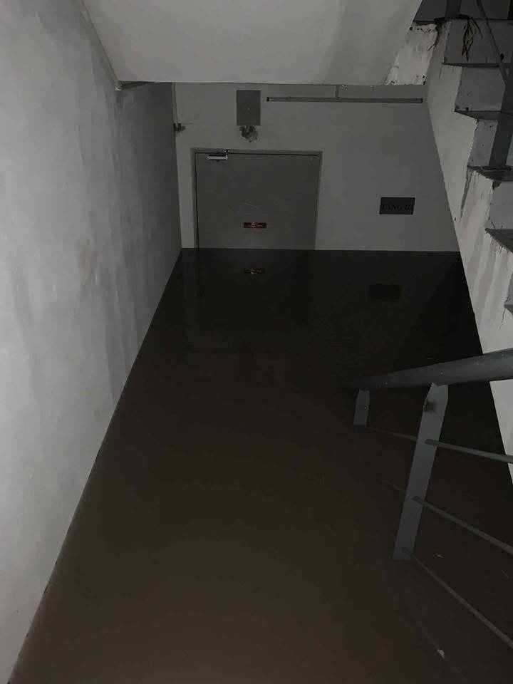 “Tôi đang đi làm nên không để ý nhiều, vì trước đây khu này chưa từng xảy ra ngập. Đến chiều, BQL tiếp tục gọi báo hầm đã ngập và cắt điện, tôi mới vội vã trở về. Khi xuống kiểm tra, tôi thấy nước từ giếng trời chảy dồn xuống các tầng hầm. Hiện B1, B2 đã rút nước, riêng B3 vẫn ngập sâu”, chị Ng. kể.