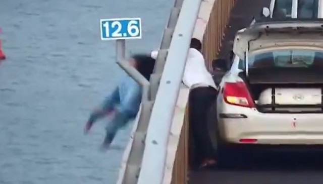 Hình ảnh ghi lại cho thấy, người phụ nữ đang ngồi bên ngoài lan can cầu. Khi nhìn thấy cảnh sát, cô ta ném một thứ gì đó xuống biển và cố gắng nhảy xuống. Ngay lập tức, tài xế taxi túm chặt lấy tóc Yadav để cứu cô không rơi xuống biển.