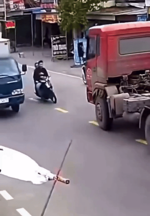 Có lẽ vì bất ngờ trước sự xuất hiện đột ngột của 2 thanh niên, tài xế container không kịp đánh lái khiến tông thẳng vào xe máy. Rất may mắn, cả 2 chàng trai này đều bị hất văng khỏi xe, ngã sõng soài trên đường. Riêng chiếc xe máy bị kẹp giữa ô tô tải và xe container gây hư hỏng. Các mảnh vỡ từ xe máy cũng rơi vung vãi trên mặt đường.
