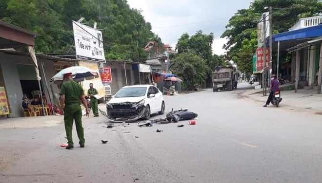Cú tông trực diện khiến đầu xe ô tô con vỡ nát, chiếc xe máy cũng bị nghiền tan tành tại hiện trường.