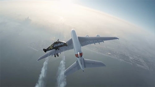 Một clip vừa đưa lên mạng ngày 5.11 đã khiến mọi người kinh ngạc khi thấy 2 người đeo chiếc cánh có động cơ phản lực trên lưng bay vèo vèo cùng với 1 chiếc máy bay khổng lồ Airbus A380 trên bầu trời Dubai.