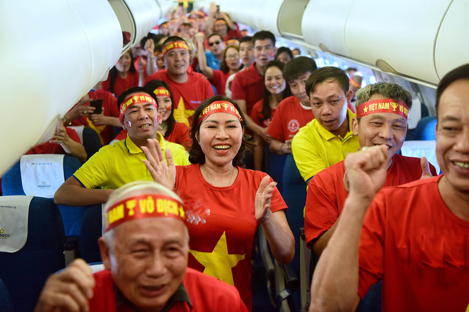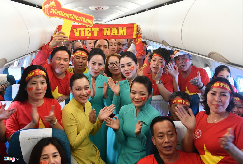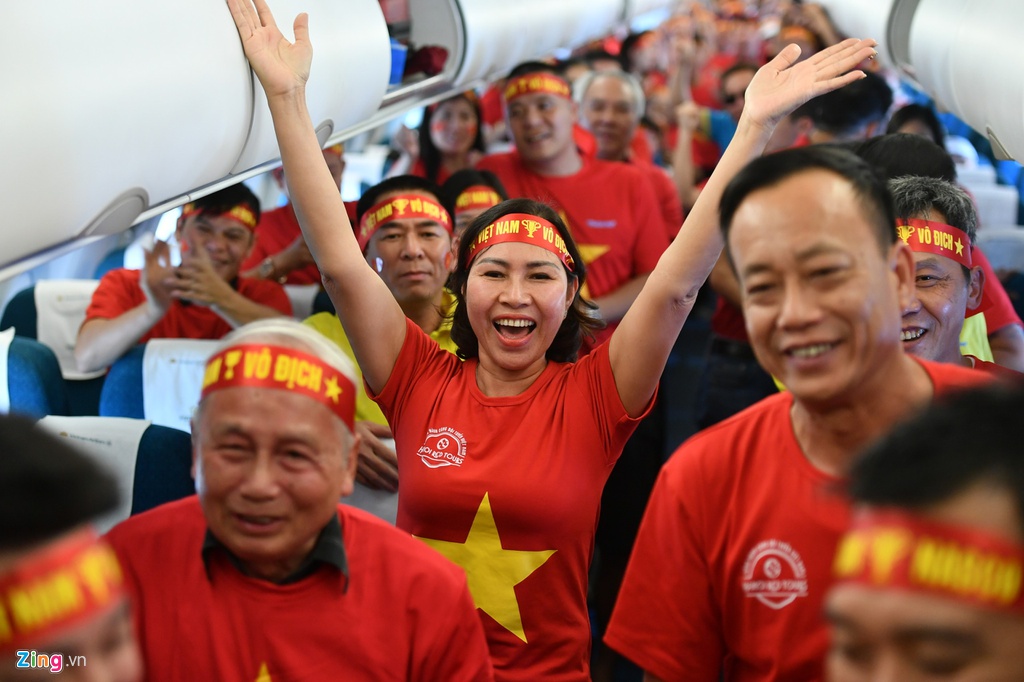 Người hâm mộ cùng nhau hát quốc ca trên chuyến bay sang Philippines để cổ vũ cho các chàng trai U22 Việt Nam trong trận chung kết tranh HCV diễn ra tối nay 10/12.