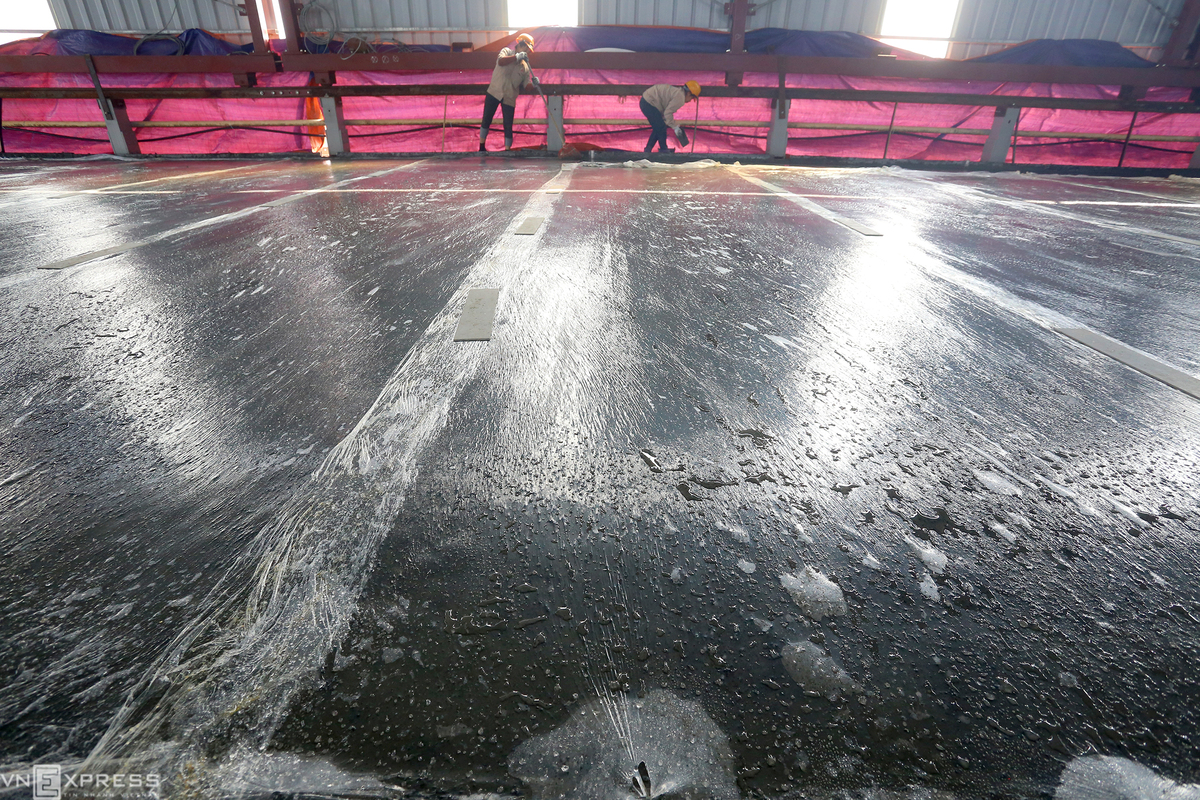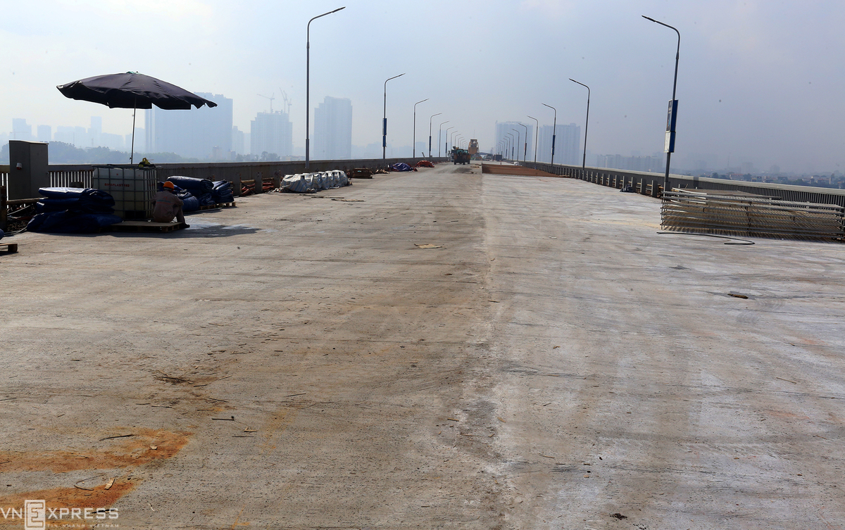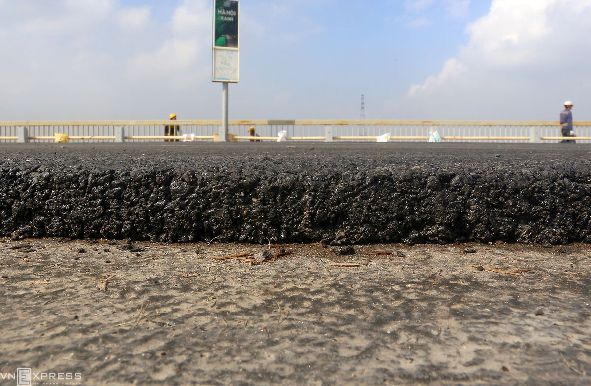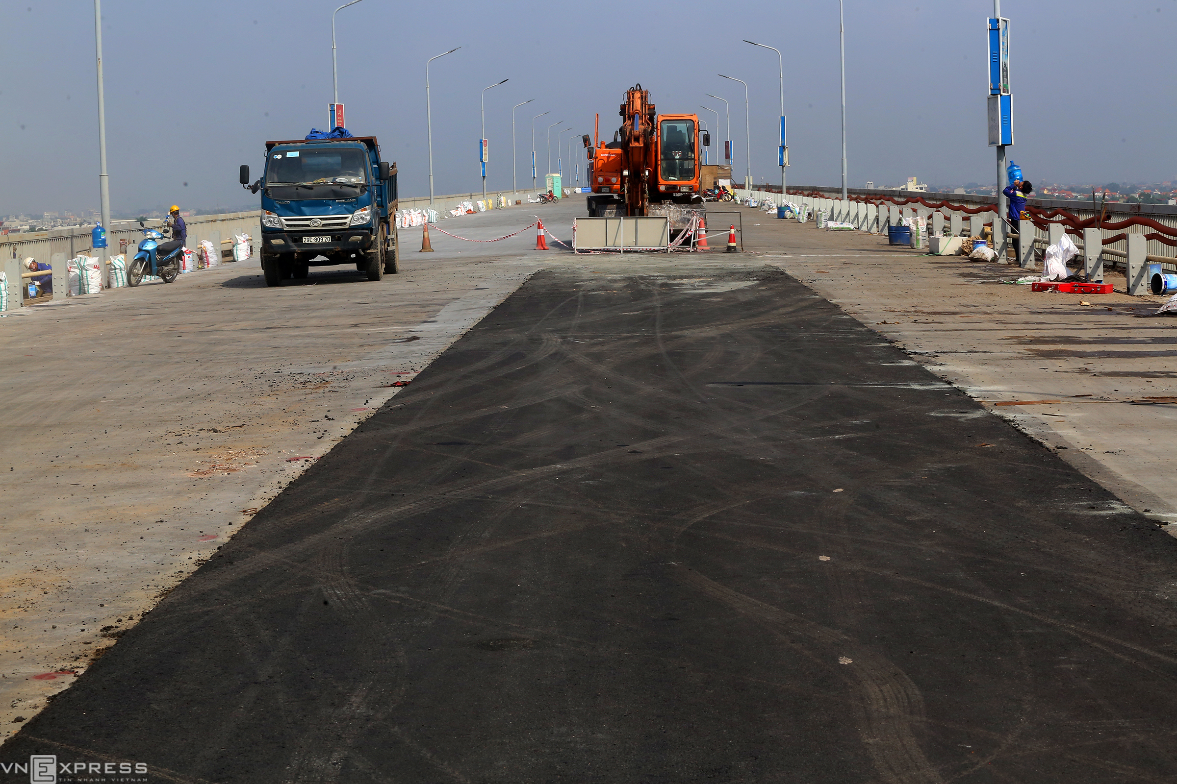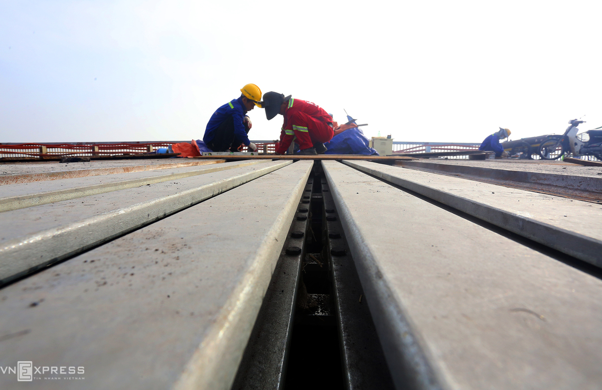 Trên cầu có 6 khe co giãn. Các công nhân đang xử lý, lắp đặt các tấm thép đúc sẵn được nhập khẩu từ Thụy Sỹ. Theo ông Trần Đức Tiến - Chủ tịch hội đồng quản trị Công ty cổ phần Thương mại Tư vấn và Xây dựng Vĩnh Hưng (đại diện liên doanh nhà thầu), công nghệ này sẽ có độ bền từ 70 đến 100 năm và phương tiện lưu thông êm thuận.