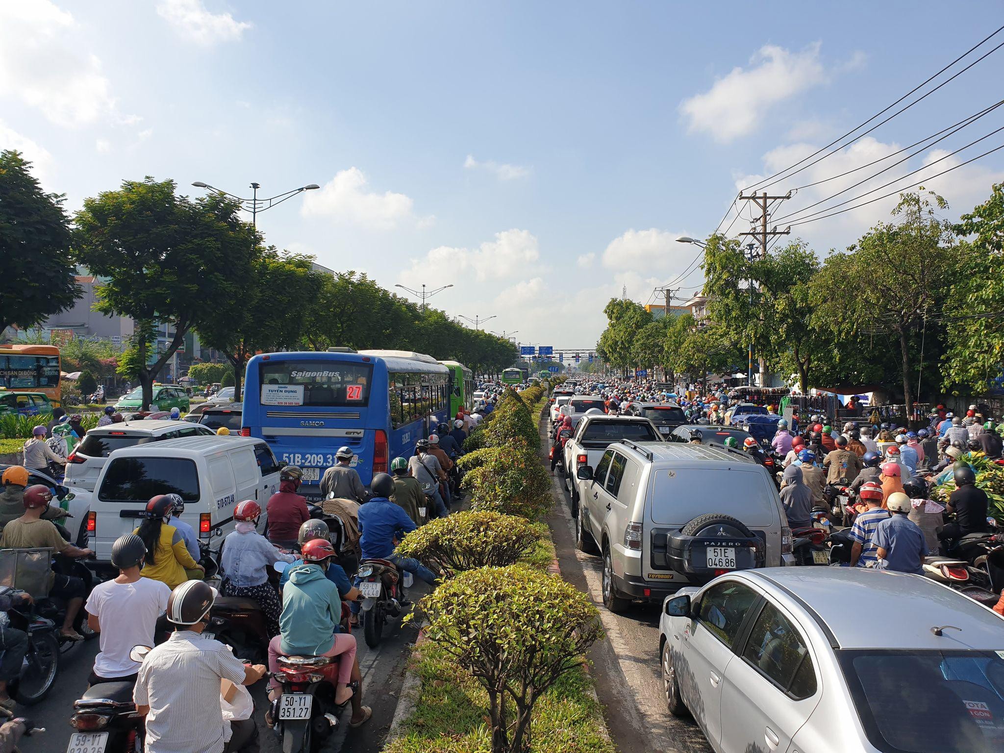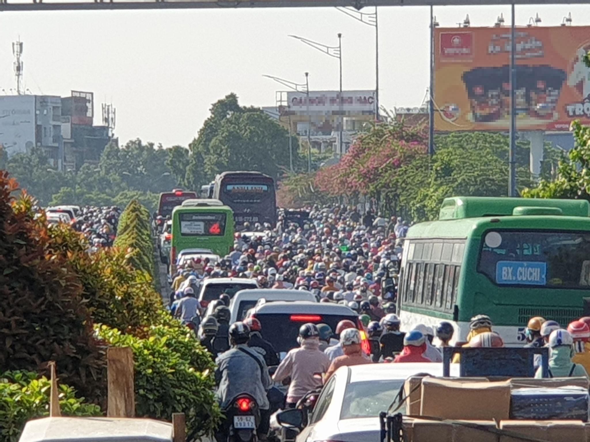 Sáng 13/4, cửa ngõ phía Tây Bắc TPHCM ùn tắc nhiều giờ đồng hồ khiến hàng nghìn người phải xếp hàng dài nhích từng chút một dưới cái nắng gay gắt.