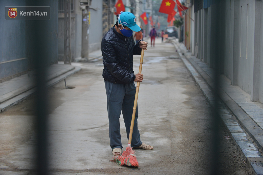 Do bị phong toả "nội bất xuất, ngoại bất nhập", một số người dân sinh sống tại tổ 11 Thị trấn Đông Anh ra quét dọn con ngõ đang được sửa lại.