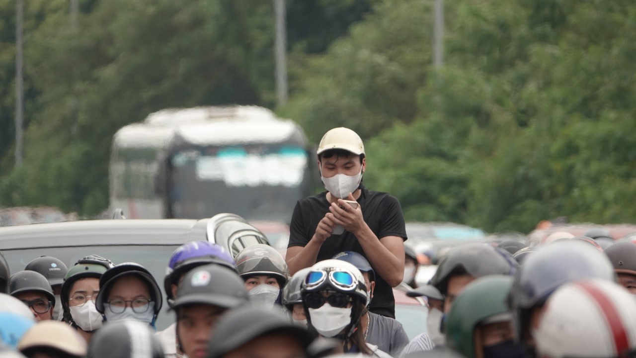 Tình trạng ùn tắc không chỉ ở đường gom đại lộ Thăng Long àm cả trên đường cao tốc cũng xảy ra tình trạng tương tự. Các phương tiện nối đuôi nhau nhích từng chút một, thậm chí là chôn chân tại chỗ cả tiếng đồng hồ.