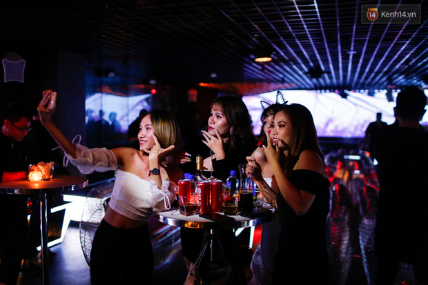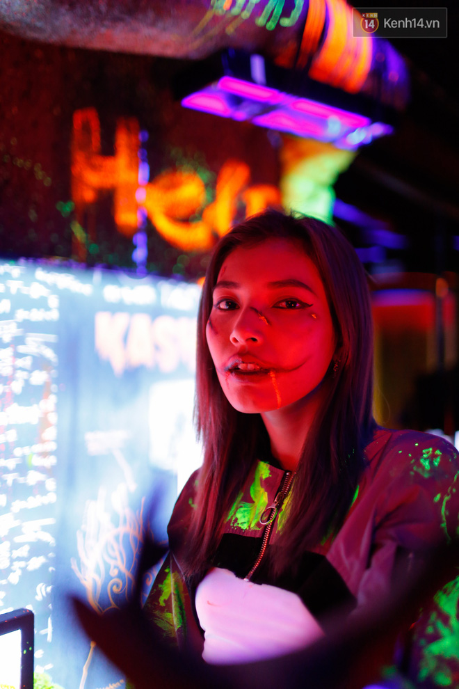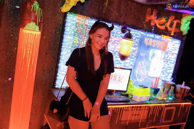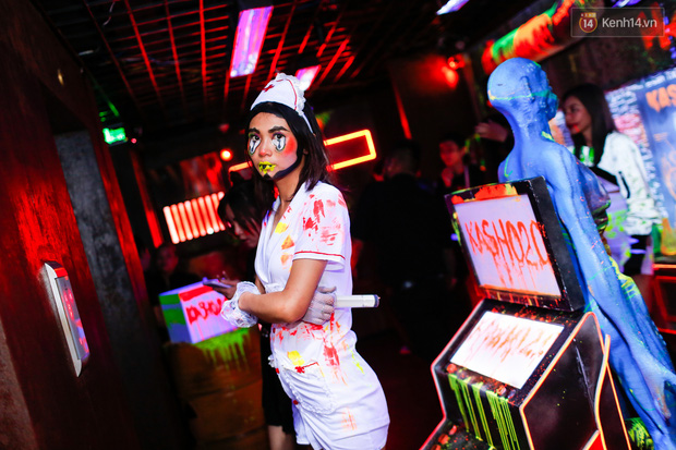 Theo ghi nhận của phóng viên tại Kasho - 1 trong những hộp đêm nhộn nhịp Sài Gòn đêm nay với buổi lên nhạc đón Halloween, rất đông các bạn trẻ, cặp tình nhân… tham dự với những màn hoá trang công phu, táo bạo. Nhiều nam thanh nữ tú không ngại xấu, biến hoá thành các nhân vật độc đáo - nét đặc sắc chỉ có trong Halloween.