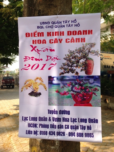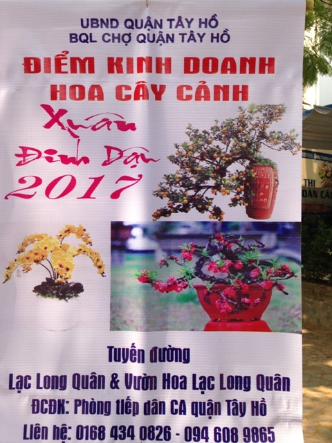 Dọc tuyến đường Lạc Long Quân, có rất nhiều tờ phướn (băng rôn) với nội dung cho đăng ký thuê điểm kinh doanh hoa cây cảnh. Các tờ quảng cáo này còn thấy ở cả Vườn hoa Lạc Long Quân. |