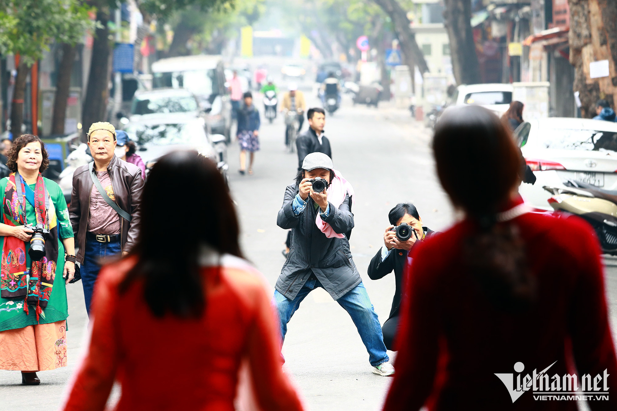 Ngoài nhiều gia đình tự tay chụp hình bằng điện thoại, hàng trăm tay máy khác cũng đổ về phố cổ để ghi lại những khoảnh khắc độc đáo trong buổi sáng vắng vẻ của ngày đầu năm mới Quý Mão.