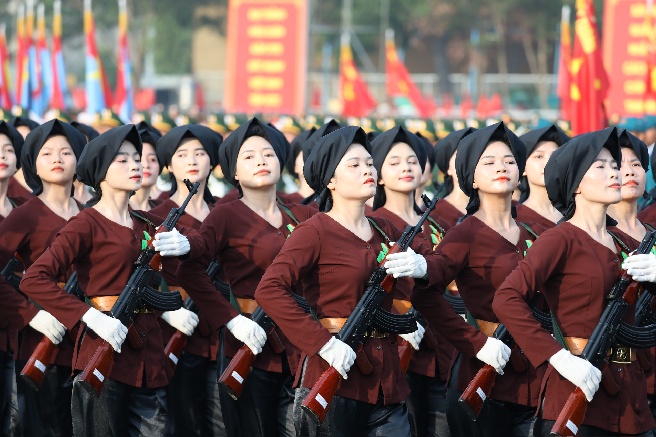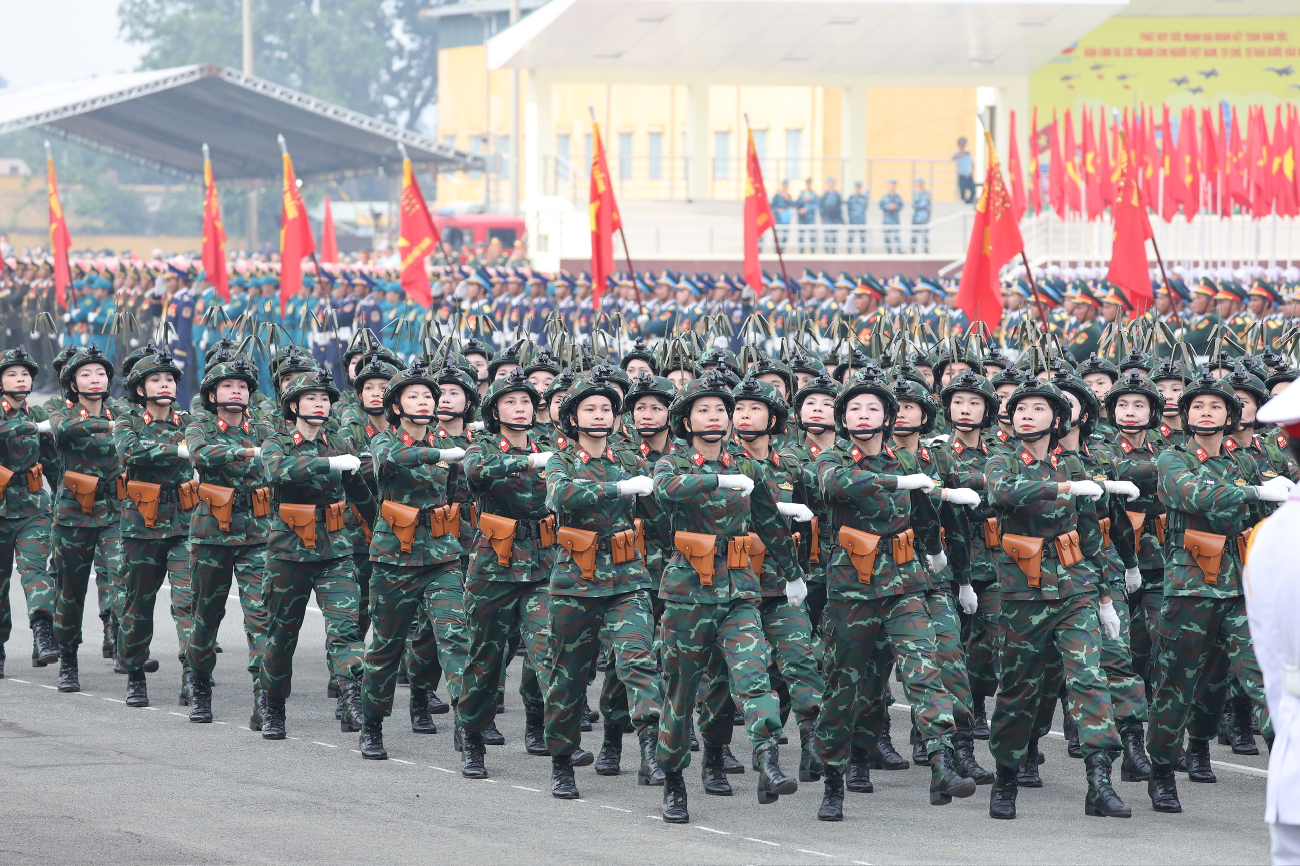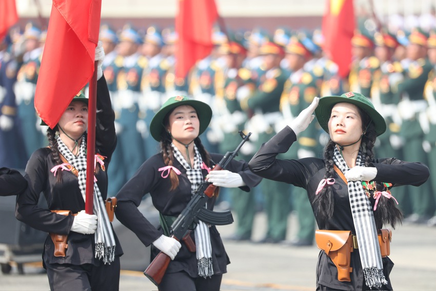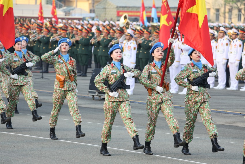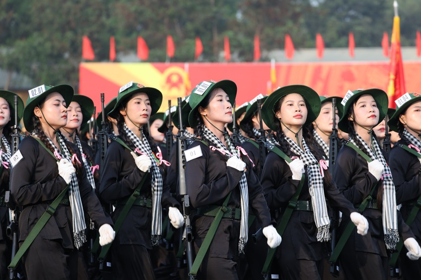 Trong buổi hợp luyện sáng 16/4 tại Trung đoàn Không quân 935 (Biên Hòa, Đồng Nai), các khối diễu binh nữ gây ấn tượng mạnh với đội hình chỉnh tề cùng vẻ đẹp rạng rỡ trong quân phục đồng bộ.